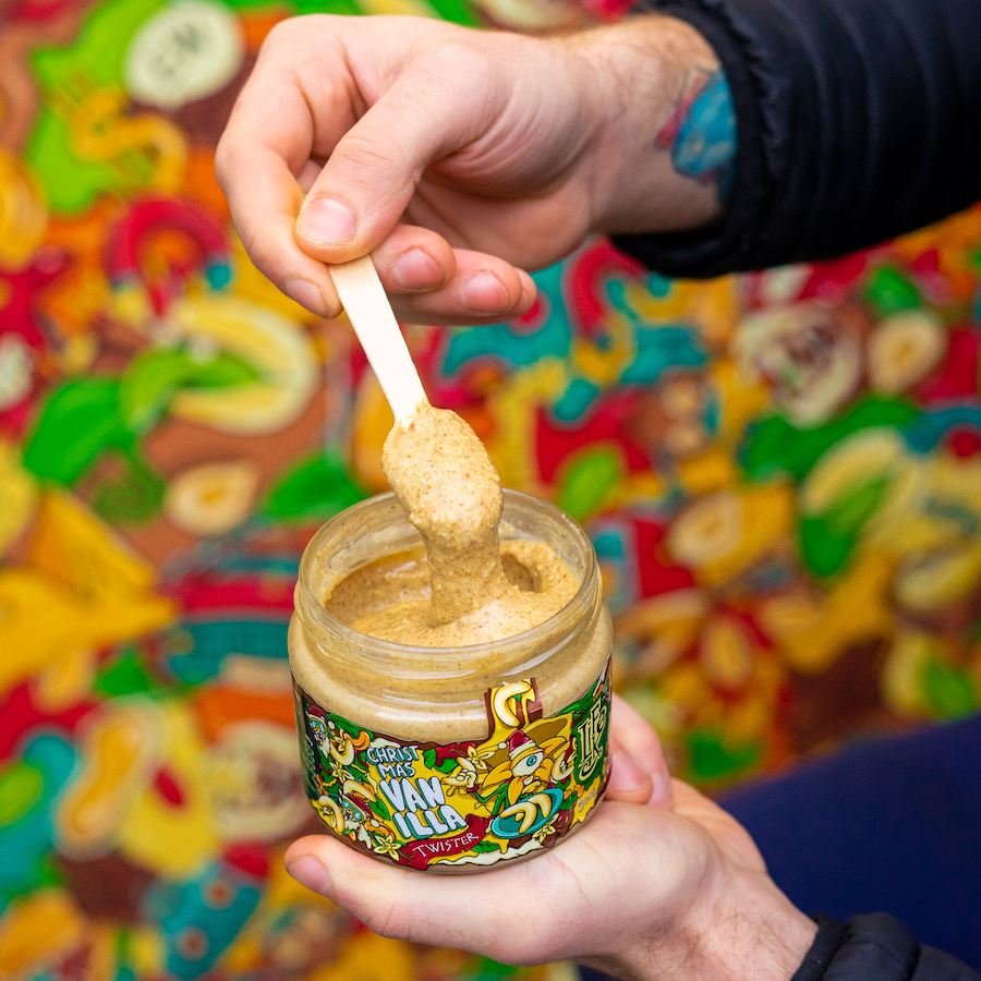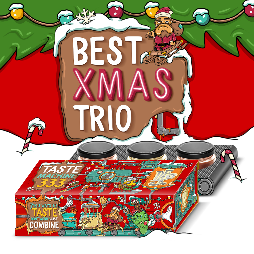 Sada obsahuje: Christmas Vanilla Twister (ořechový krém s vanilkou) 300g, Almond Gingerbread Cream Twister (ořechový krém s perníkovým kořením) 300g, Eggnog Twister (ořechový krém s příchutí vaječného likéru) 190g