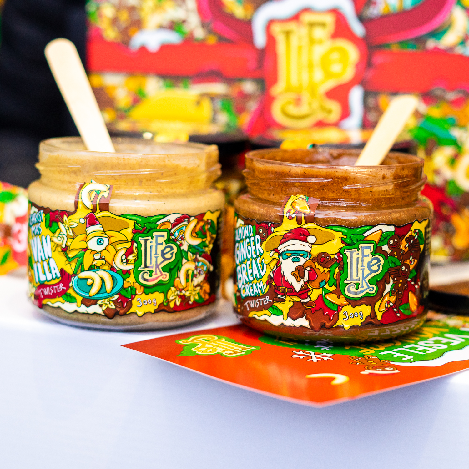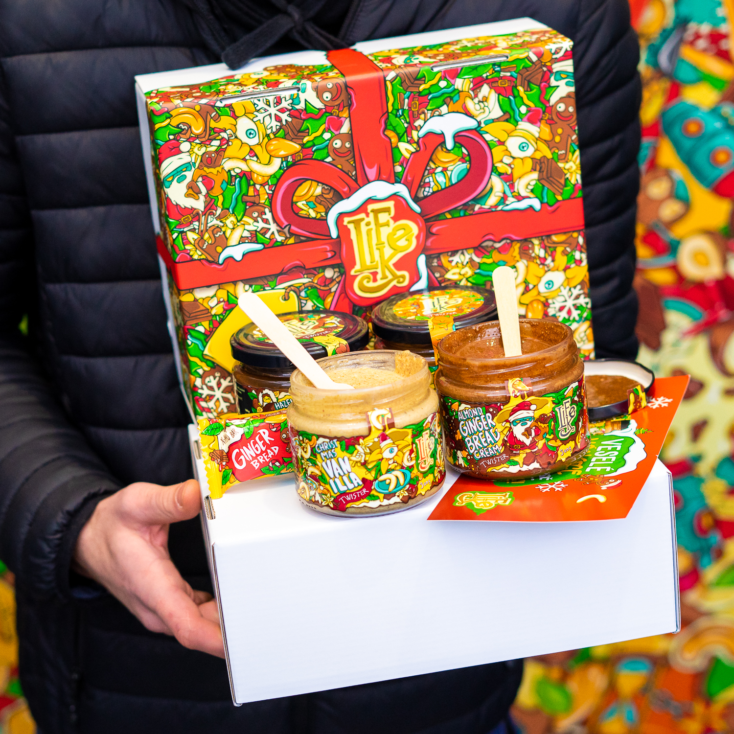 Dárková krabička LifeLike obsahuje vybrané oříškové krémy – CHRISTMAS VANILLA TWISTER, PERNÍČEK TWISTER, NOUGAT TWISTER, CARAMEL TWISTER a datlovou X-MASS tyčinku s perníkovým kořením 🤩
